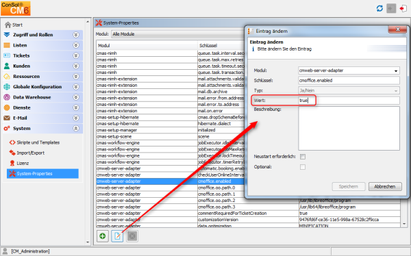 Wenn Sie CM.Doc in Ihrem ConSol CM-System aktivieren möchten, müssen Sie zuerst die System-Property cmweb-server-adapter, cmoffice.enabled auf true setzen.