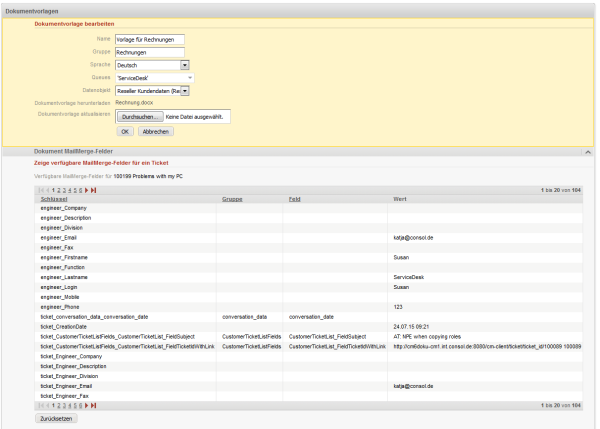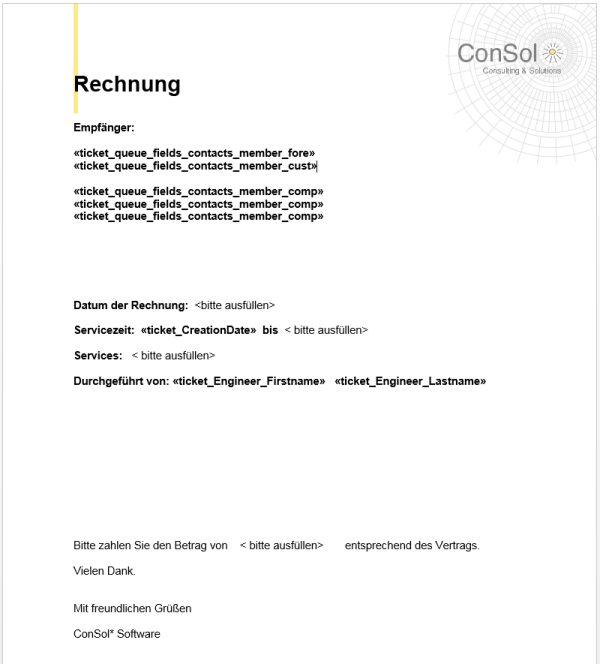 Folgende Daten aus Tickets können automatisch in die Vorlage integriert werden: