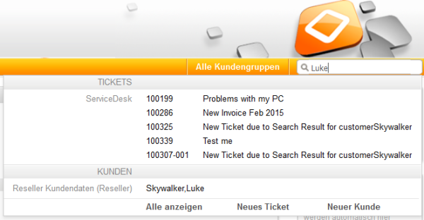 Informationen über die Verwendung der Suchfunktion finden Sie im ConSol CM Benutzerhandbuch, Abschnitt Suchen nach Tickets, Kunden und Ressourcen.