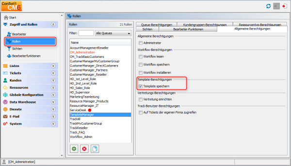 Wir empfehlen Ihnen, eine Rolle (z. B. TemplateManager) zu erstellen, die nur die Berechtigung Template speichern hat, und an die keine Queue-Berechtigungen oder anderen Berechtigungen vergeben werden. Jedem Benutzer, der Zugang zum Textvorlagen-Manager soll, kann diese Rolle zugewiesen werden. Auf diese Weise werden normale Berechtigungen (z. B. Queue- und Kundengruppen-Berechtigungen) und Berechtigungen für den Textvorlagen-Manager nicht vermischt und Sie können die Berechtigung für den Textvorlagen-Manager schnell vergeben und entziehen.