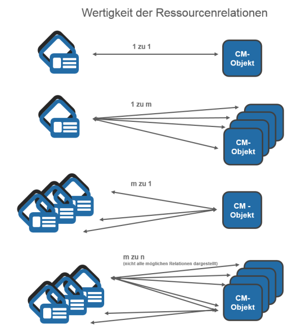 Für die Ressourcenrelation muss die Wertigkeit (Kardinalität) definiert werden, d. h. für jede Relation ist definiert, für wie viele Objekte des ausgewählten Objekttyps eine Relation erstellt werden kann. Folgende Einstellungen sind bei der Wertigkeit (Kardinalität) der Ressourcenrelation möglich: