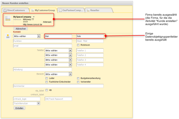 Abbildung 249: ConSol CM Web Client - Beispiel für manuelle Kundenaktivitäten