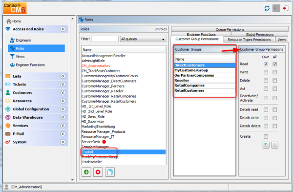 In our example, the role TrackAll has read access to all customer groups. In your system, it might be required to create different CM.Track roles with access to different customer groups. For a detailed introduction to role administration, please refer to section Role Administration.