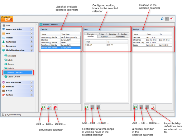 Figure 245: ConSol CM Admin Tool - Global configuration: Business calendars