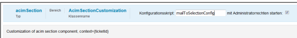 Für jedes Element gibt zudem ein Konfigurationsskript, mit dem die Werte dynamisch definiert werden können. Das Skript wird im Kontext des aktuell angemeldeten Bearbeiters ausgeführt. Die Berechtigungen des Bearbeiters können das Ergebnis des Skripts also beeinflussen. Wenn Sie zum Beispiel Code verwenden, um alle Tickets auszuwählen, wird die Anzahl der Tickets je nach Queue-Berechtigungen des aktuellen Bearbeiters unterschiedlich sein. Wenn Sie innerhalb des Skripts globalen Zugriff benötigen, können Sie es immer auch mit Administratorrechten ausführen, indem Sie die entsprechende Checkbox markieren. Innerhalb des Skripts sind die Objekte des Kontextes verfügbar (siehe folgende Abbildung: Beispiel mit ticketId).