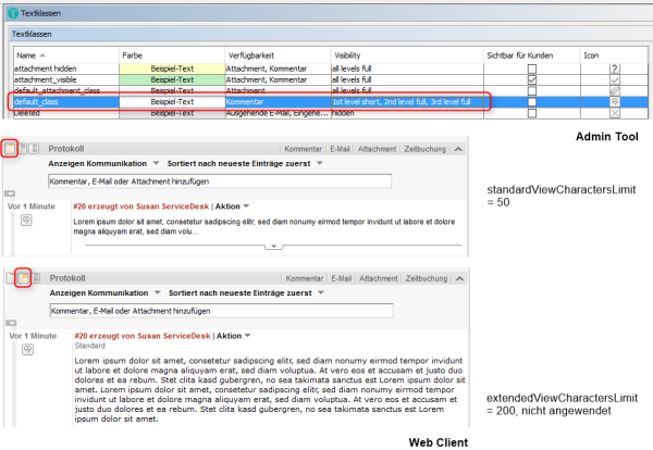 Außerdem können Sie die Anzahl der Zeilen ändern, die für Kommentare im Sichtbarkeitslevel 1st (Standard) und 2nd (Erweitert) angezeigt werden. Dies kann für Einträge im Ticketprotokoll geschehen, die mit einer Textklasse markiert sind, die für die beiden ersten "kurzen" Level gilt, d. h. für Text mit der Sichtbarkeit 1st level short und 2nd level short.