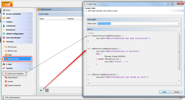 Please note that if the system property start.groovy.task.enabled in module cmas-app-admin-tool is set to true, and thus if you, as an administrator, can execute tasks using the Admin Tool, you have to be absolutely sure what the task will be doing!!! Be aware of the risks involved with tasks which, for example, delete customer data or tickets and should only be executed via a workflow or Admin Tool script!