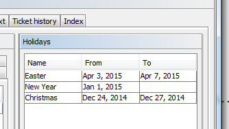 Aside from working hours, you can define holidays, too. On these days the automatic escalation pauses entirely. Holidays have to be defined per calendar. It is not possible to define a holiday that is valid for all existing calendars simultaneously.