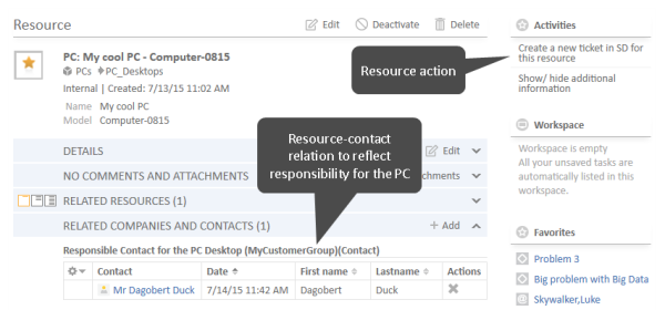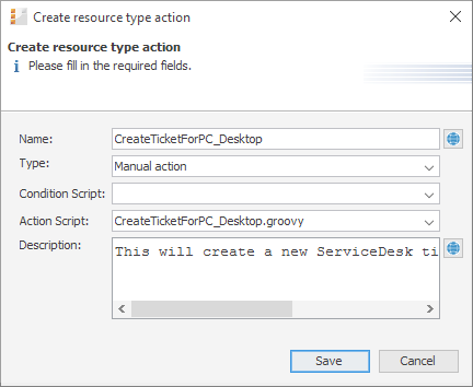 Use case: The engineer should be able to create a new Service Desk ticket directly from a resource page of a PC. The new ticket should be related to the resource (PC). The main contact of the new Service Desk ticket should be the person who is responsible for the PC. This is implemented as resource-contact relation in the resource type PC_Desktops. To implement the resource action, perform the following steps.