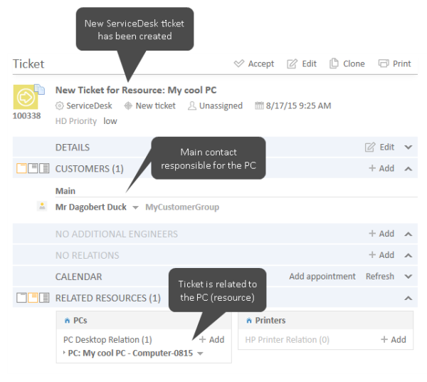 Figure 582: ConSol CM Web Client - Resource page with one or more ticket relations (new Service Desk ticket)