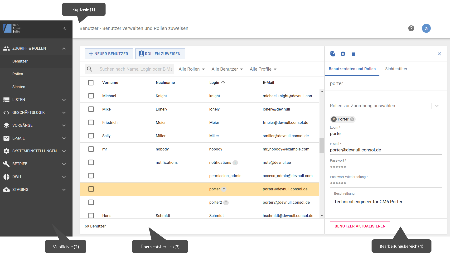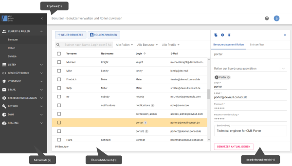 Sie arbeiten im Hauptbereich (3 und 4). Der Inhalt hängt vom ausgewählten Menüelement und der aktuellen Aktion ab. Normalerweise wird bei der Auswahl eines Menüelements ein Übersichtsbereich (3) angezeigt, der die gesamte Breite des Hauptbereichs umfasst.
