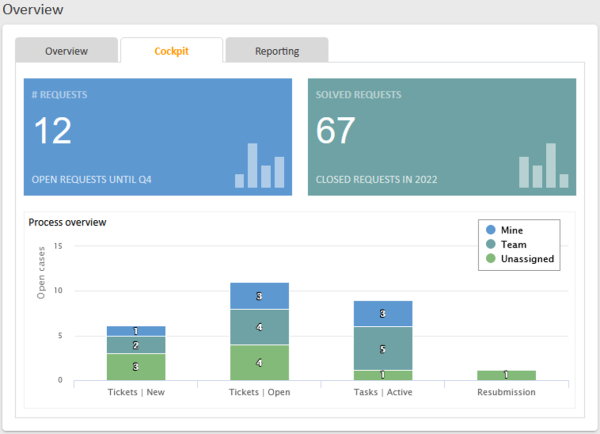 The dashboard is a standard component of the Web Client for sharing reports with the users. It is displayed on the start page after logging in. The dashboard is configured in the Web Client by adding widgets to one or several tabs. The widgets can display reports, highlight specific cases or show any other information which is helpful for the users in their daily work.