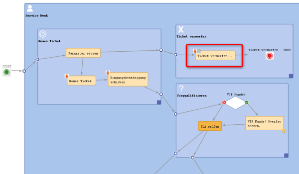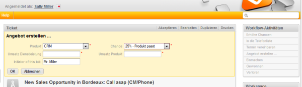 Zum Beispiel kann ein Helpdesk-Mitarbeiter eine Beschwerde nicht ohne Angabe von Gründen ablehnen. Dies ist im Prozess über ein ACF implementiert, das angezeigt wird, wenn der Bearbeiter auf die Workflow-Aktivität Ticket verwerfen klickt. Es wird ein Formular geöffnet, in dem der Bearbeiter eine Kategorie für die Ablehnung auswählen muss und eine Bemerkung in das Textfeld eingeben kann. Oder, am Beispiel eines Sales-Prozesses, wenn ein Bearbeiter (in diesem Fall ein Vertriebsmitarbeiter) auf Termin mit potentiellem Kunden vereinbaren klickt, wird ein Formular angezeigt, in dem er das Budget, die Größe der Firma des Kunden und die Produkte, für die sich der Kunde interessiert, eingeben kann.