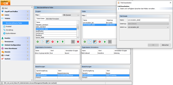 Abbildung 120: ConSol CM Admin Tool: Verwaltung der Benutzerdefinierten Felder für Ticketdaten (CM-Version 6.10)