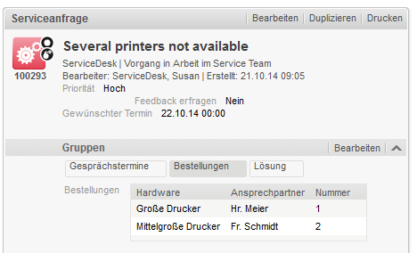In echten Prozessen sind die Anforderungen normalerweise komplexer. Es ist häufig erforderlich, alle Ressourcen eines bestimmten Typs abzurufen, die über eine bestimmte Art von Relation mit einem Ticket oder einer Ressource verknüpft sind. Dieses Thema wird detailliert im Abschnitt Arbeiten mit Ressourcenrelationen.