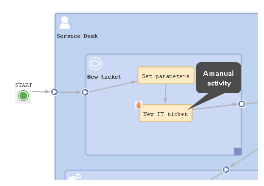 The activity is marked with the red hand/manual icon in the Process Designer GUI. The activity is available as workflow activity in the Web Client and is performed when the engineer has clicked on this activity. It is only available in a certain, strictly defined position of the ticket within the process.