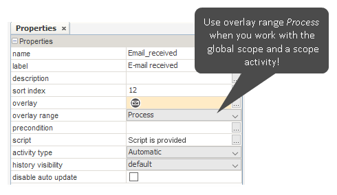When an email has been received for a ticket which is currently in the scope, the ticket icon in the Web Client GUI should be marked with the overlay mail. The engineer has to confirm that he/she has read the email. Since the email trigger is attached to the global scope and thus an email can be received during the entire process, the acknowledgment activity can be implemented very well using a scope activity. In this way, the acknowledgment activity (named Set confirmation: email read in our example) is also available during the entire process.