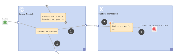 - Die Aktivität Ticket verwerfen ... wird ausgeführt (wenn diese Aktivität ein Skript hat, wird das Skript ausgeführt). Das Ticket durchläuft den Knoten und setzt seinen Weg fort (3). Im obigen Beispiel wird es geschlossen.