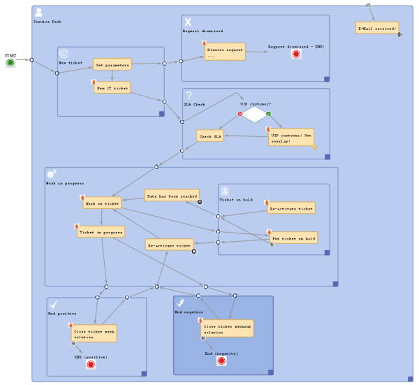 Please keep in mind that you can always use triggers in inner scopes which will then consume the event (see section Firing order of business event triggers in hierarchical scopes as an example for business event triggers). For example, if you would like to use a mail trigger in the entire process in the global scope but you need a certain reaction of the ticket in the Finished scope, you can use a mail trigger which is attached to the Finished scope.