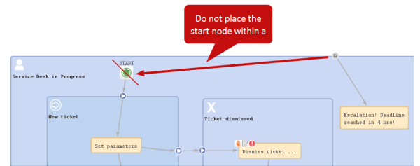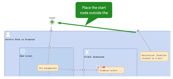 The best position of the start node (see section Start nodes) depends on the use of triggers in the following scope. If time triggers are used in the first scope, where tickets are forwarded after the start node, the start node should be placed outside the scope. In case the start node is placed inside the first scope, the time trigger might not be initialized correctly. So place the start node in the default scope.