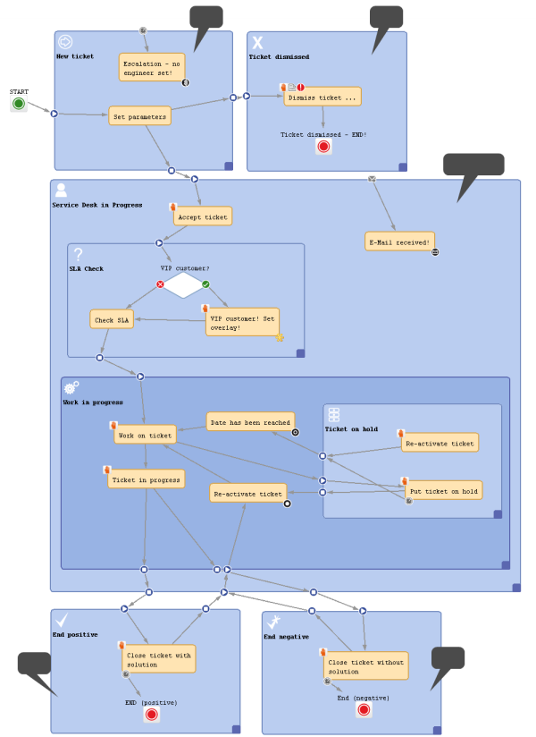 - The process logic is stored at two separate places, i.e., you always have to work with the Process Designer as well as with the Admin Tool to see the entire process.