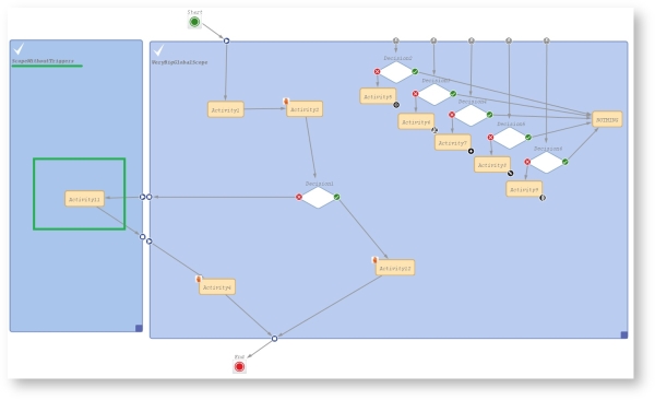 A global scope is a scope which contains all other scopes of the workflow. You might want to use such a global scope because some processes require reactions to events during the entire process. Those events are implemented using triggers which are attached to the global scope. For example, if you want to supervise for the entire process, if an email has been received, you attach a mail trigger (see section Mail triggers) to the global scope. All sub-scopes of the global scope inherit the sensitivity to this trigger. If the email should only be monitored for a sub-scope, you can attach the mail trigger to this sub-scope.
