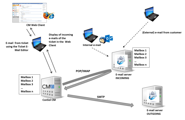 In order to receive emails, ConSol CM connects to a mail server and retrieves emails from one or more mailboxes. ConSol CM acts like a regular email client (e.g., Thunderbird, Microsoft Outlook) and uses standard email protocols like IMAP or POP3. If you want to use the secure version, IMAPs and POPs are also supported, in which case the required certificates have to be installed on the server. For a detailed explanation about how to send encrypted emails with CM, please refer to the ConSol CM Administrator Manual, section Email Encryption.