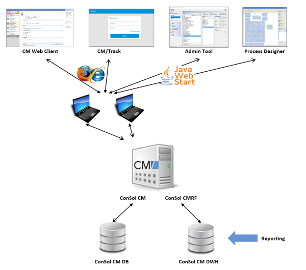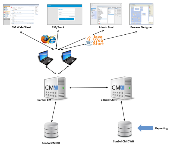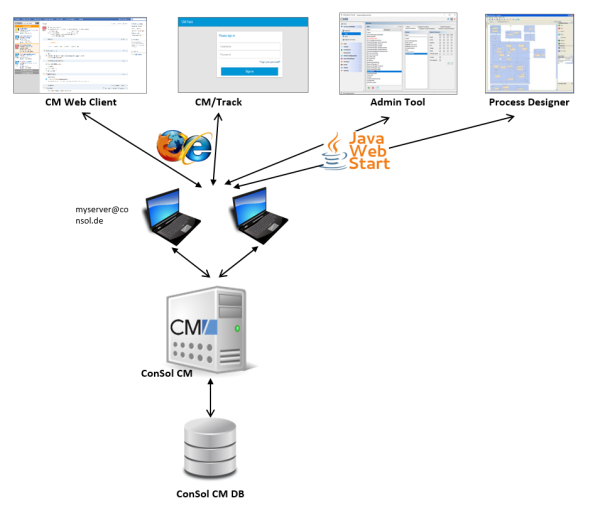 ConSol CM is a Java EE application which is based on the classical three-tier architecture. The ConSol CM server is deployed in an application server and accesses a relational database. Two web interfaces are available as client interfaces: the standard interface is the ConSol CM Web Client, which is used by the engineers to work on the tickets. Another web client is the ConSol CM portal, CM/Track. This provides access to the system for customers who might want to know some basic facts about the status of their tickets. The two Java applications which are used to configure ConSol CM are the Admin Tool and the Process Designer. Both can be downloaded from the ConSol CM start page using Java Web Start (JWS). JWS is a component of every recent Java edition, so no extra installation is required on the PCs or Laptops you want to use to administer the system. On the contrary - you can do this from every regular web client with a supported web browser. Please make sure that the versions of all components which are used in your company meet the system requirements.