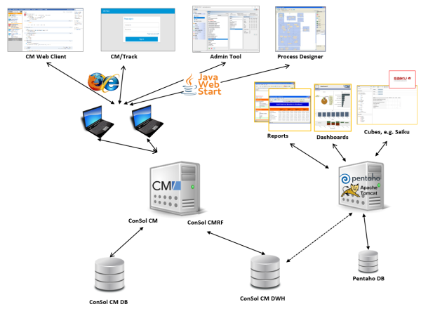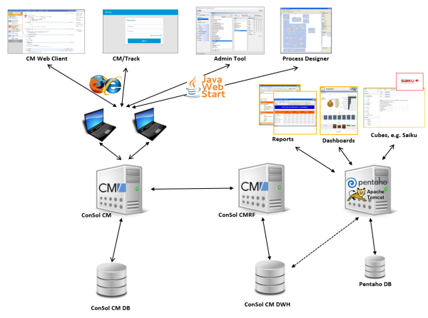 In order to allow Business Intelligence (BI) tools or other applications to build specific reports, OLAP cubes, and other analyses, ConSol CM provides a data warehouse (DWH) as one of its standard components. The DWH is a separate database (or database scheme, see below). The DWH is filled by a Java EE application called ConSol CM Reporting Framework (CMRF).