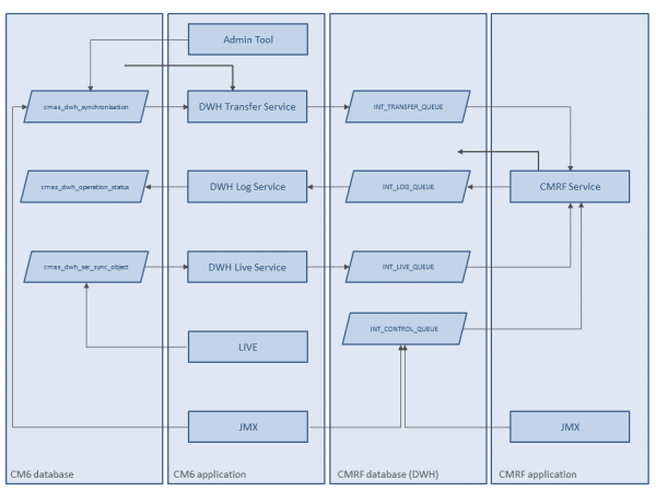 Figure 13: Services and tables involved in CM/CMRF/DWH data transfer (DIRECT mode)