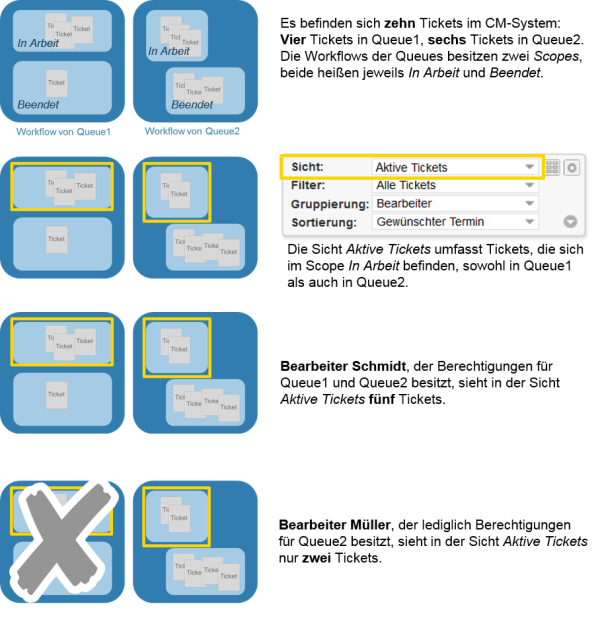 Zwei Berechtigungen wirken sich auf die Sichtbarkeit von Tickets in Ihrem CM-System aus: