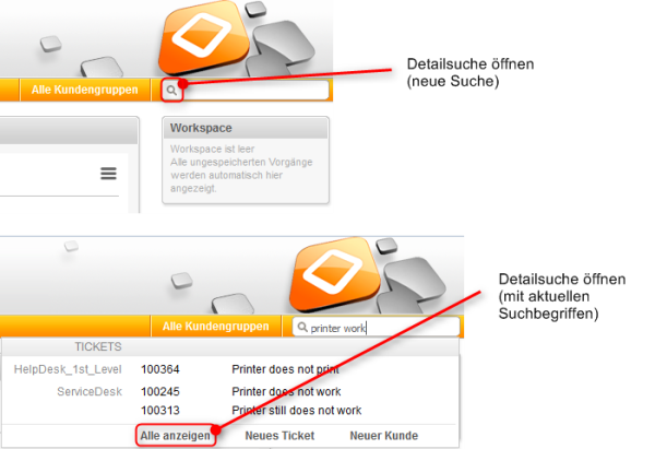 Mit der Detailsuche finden Sie alle Tickets, die sich aktuell in Queues befinden, für die Sie mindestens Leseberechtigungen haben, und deren Hauptkunde zu einer Kundengruppe gehört, für die Sie mindestens Leseberechtigungen haben (siehe Welche Tickets können Sie sehen?). Die Detailsuche zeigt offene Tickets sowie bereits geschlossene Tickets (außer Sie schließen eins von beiden mit dem Suchkriterium Status aus).