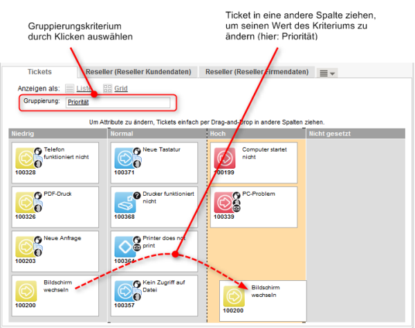 Im Tab Tickets können Sie die Suchergebnisse auch als Grid anzeigen. Klicken Sie dafür neben Anzeigen als auf den Button Grid. In der Grid-Ansicht können Sie ein Kriterium auswählen, nach dem die Ergebnisse gruppiert werden sollen. Es gibt eine Spalte für jeden Wert des Gruppierungskriteriums und Sie können Tickets von einer Spalte in eine andere Spalte ziehen, um diesen Wert im Ticket zu aktualisieren.