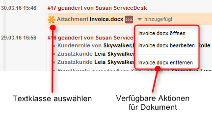 Der Protokollbereich enthält sowohl manuell hinzugefügte Attachments als auch Attachments aus eingehenden E-Mails. Sie können zusätzliche Aktionen für diese Attachments durchführen: