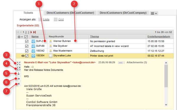 Die Ticketvorschau zeigt immer den letzten Kommentar oder die letzte E-Mail des Tickets. Sie hat folgende Funktionen: