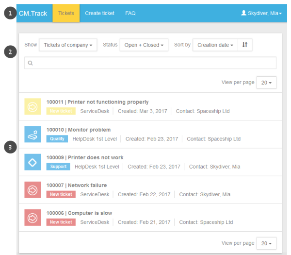 The overview screen is displayed when the customer logged in to CM.Track. It consists of a menu bar (1) and the ticket list (3) including several options for filtering, sorting, and navigating the ticket list (2).