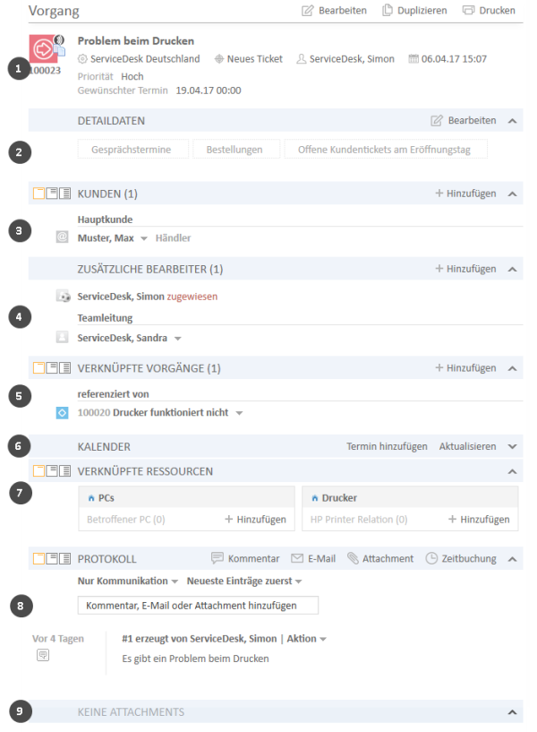 Die Überschrift des Bereichs kann Vorgang, Ticket oder ähnlich lauten. Der Kopfbereich ist immer der erste der Vorgangsbereiche. In der linken Ecke befindet sich das Vorgangs-Icon (siehe Das Vorgangs-Icon). Neben dem Vorgangs-Icon sehen Sie das Vorgangsthema. Unter dem Vorgangsthema werden die grundlegenden Vorgangsdaten angezeigt, z. B. die aktuelle Queue und der Bereich, der zugewiesene Bearbeiter und das Erstellungsdatum. Weitere Vorgangsdaten werden von Ihrem CM-Administrator über Benutzerdefinierte Felder konfiguriert. In der rechten Ecke befinden sich Links zum Editieren, Duplizieren und Drucken des Vorgangs (siehe Aktualisieren von Vorgängen).