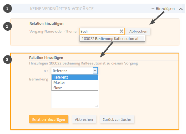- Wählen Sie die Art der Relation. Sie können auf den Button Zurück zur Suche klicken, um zur Autocomplete-Suche zurückzukehren, und einen anderen Vorgang auszuwählen. Optional können Sie eine Bemerkung hinzufügen. Klicken Sie auf Relation hinzufügen, um die Relation zu speichern.