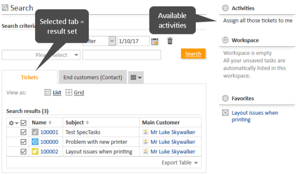 Search activities allow you to perform certain actions for the current set of search results. The set of search results includes either cases, or contacts of a specific customer group, or resources of a specific resource type. Search activities become available when you carried out a Detailed Search and clicked the tab with the desired objects.