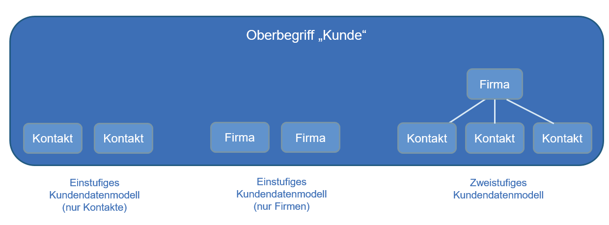 Das Kontaktdatenmodell bestimmt auch, welche Datenfelder verfügbar sind und welche Relationen möglich sind. In einem CM-System kann es mehrere Kontaktdatenmodelle geben.