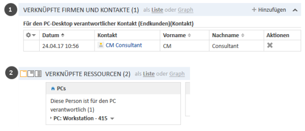 Die Kontaktrelationen werden auf der Ressourcenseite im Bereich für verknüpfte Kontakte angezeigt. Für jedes Relationsmodell gibt es eine Tabelle. Die Überschrift gibt den Namen des Relationsmodells, die Zielkundengruppe und die Kontaktart, die Firma, Person oder Beliebig sein kann, an (1). Wenn die Kontaktart Beliebig ist, d. h. entweder Person oder Firma, gibt es zwei Tabs: einen für Relationen zu Personen und einen für Relationen zu Firmen (2).