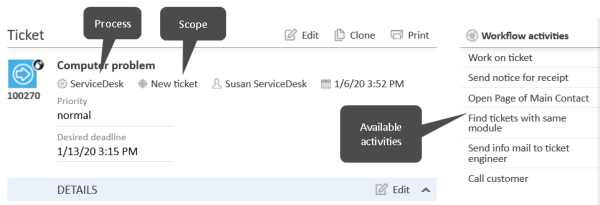 The available activities are displayed in the upper right corner of the Web Client. They always refer to the object displayed in the main working area.