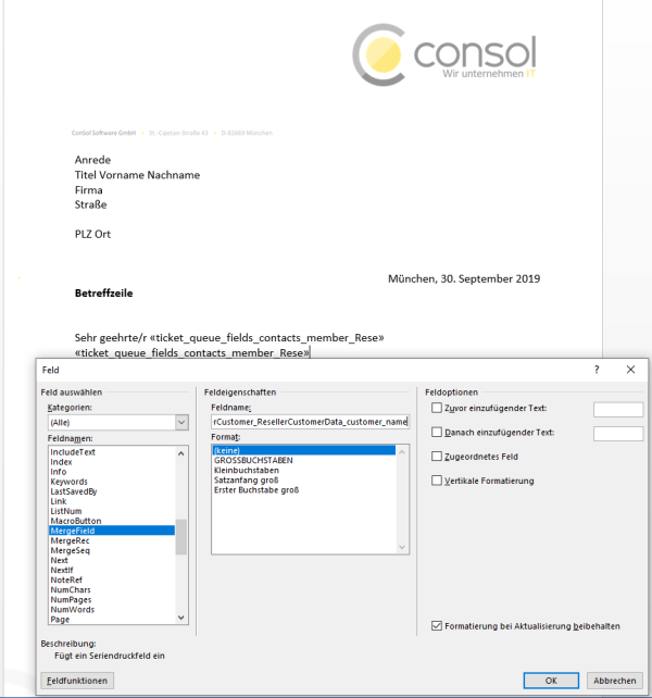 - Klicken Sie auf den Button Einfügen, um das Feld an der aktuellen Cursor-Position in das Dokument einzufügen.
