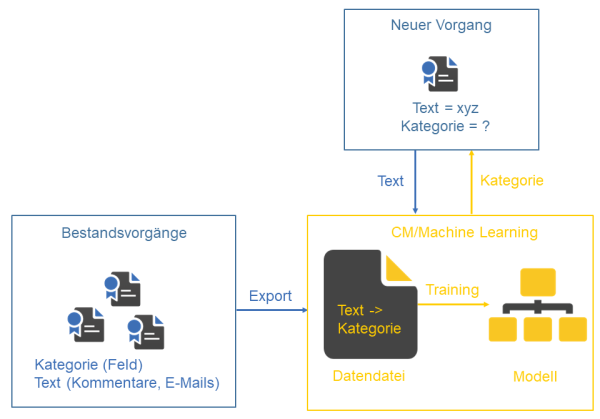 - Neue Vorgänge, die klassifiziert werden sollen, haben schon Text, z. B. den initialen Kommentar oder die E-Mail, aber ihre Kategorie ist noch nicht bekannt. Zur Bestimmung der Kategorie wird das Machine-Learning-Modell abgefragt, um anhand des verfügbaren Vorgangstextes eine Vorhersage der Kategorie zu treffen.