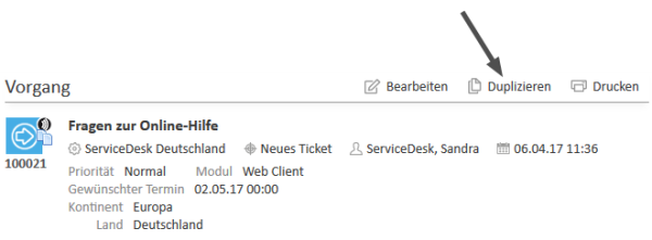 Im Web Client kann ein Vorgang über die Option Duplizieren im Vorgangsmenü dupliziert werden.