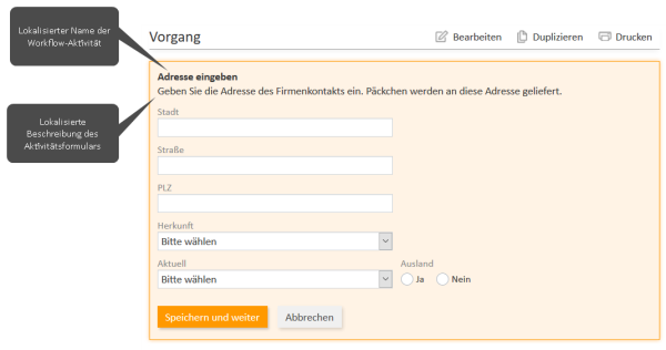 Klicken Sie auf den Button Neues Aktivitätsformular. Geben Sie den internen Namen und die lokalisierten Beschreibungen für das Aktivitätsformular ein. Sie können dem Formular auch schon Vorgangsfelder zuweisen.