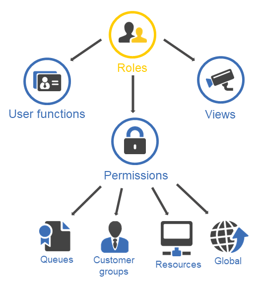The definition of a role consists of assigning the required permissions, views and user functions. The permissions are grouped in four categories: