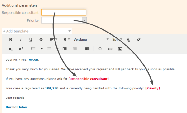 Text templates are boilerplates consisting of text and variables, which allow to automatically insert data of the current user or case. They are used in emails and comments. Text templates help to keep emails consistent regarding wording and layout, and increase the productivity of the users who do not have to type as much text.