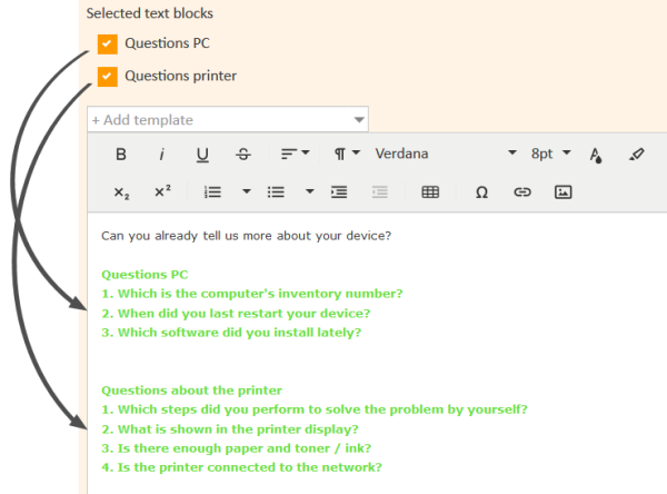 When using a text template, the template content is inserted into the comment or email editor. The user can edit it as desired to create the final comment or email. It is possible to use several templates for a comment or email.