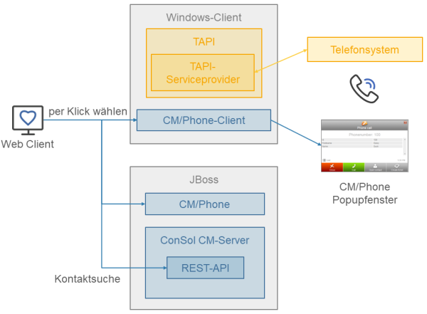 Die folgende Abbildung zeigt, wie CM/Phone mit dem Telefonsystem und ConSol CM integriert ist.